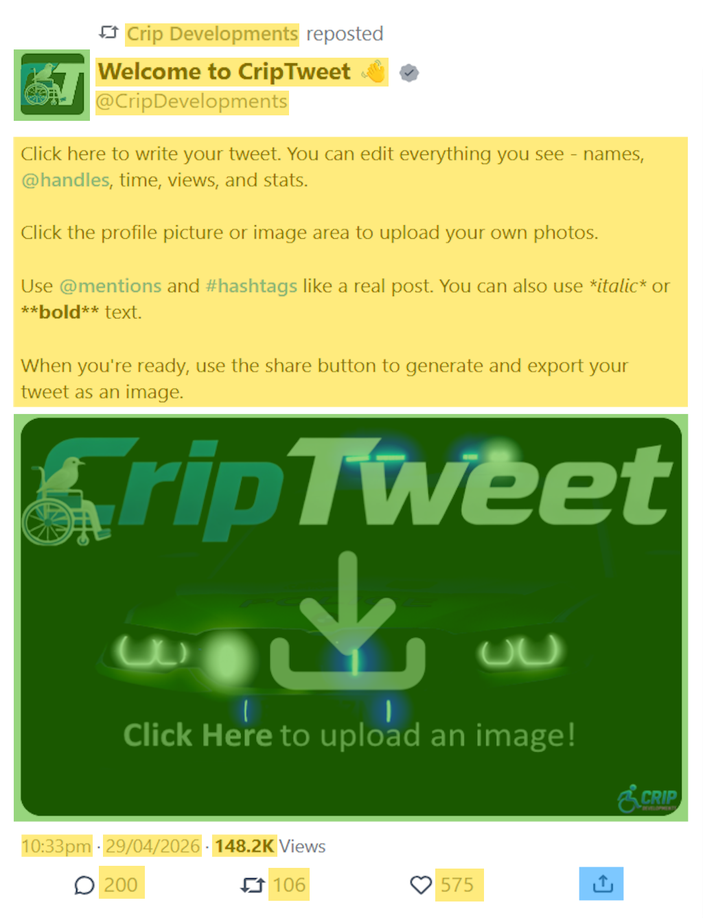 Click here to write your tweet. You can edit everything you see - names, @handles, time, views, and stats.